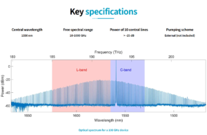 1550nm帯で動作するKerrソリトン周波数コムである本製品は、等間隔に並んだ多数の高コヒーレンス光スペクトル(コム)を生成できるフォトニック集積型デバイスです。小型チップ上で高品質なコム生成(FSR:10~1000GHz)を実現し、分光・通信・計測などの先端分野における多波長光源として活用できます。